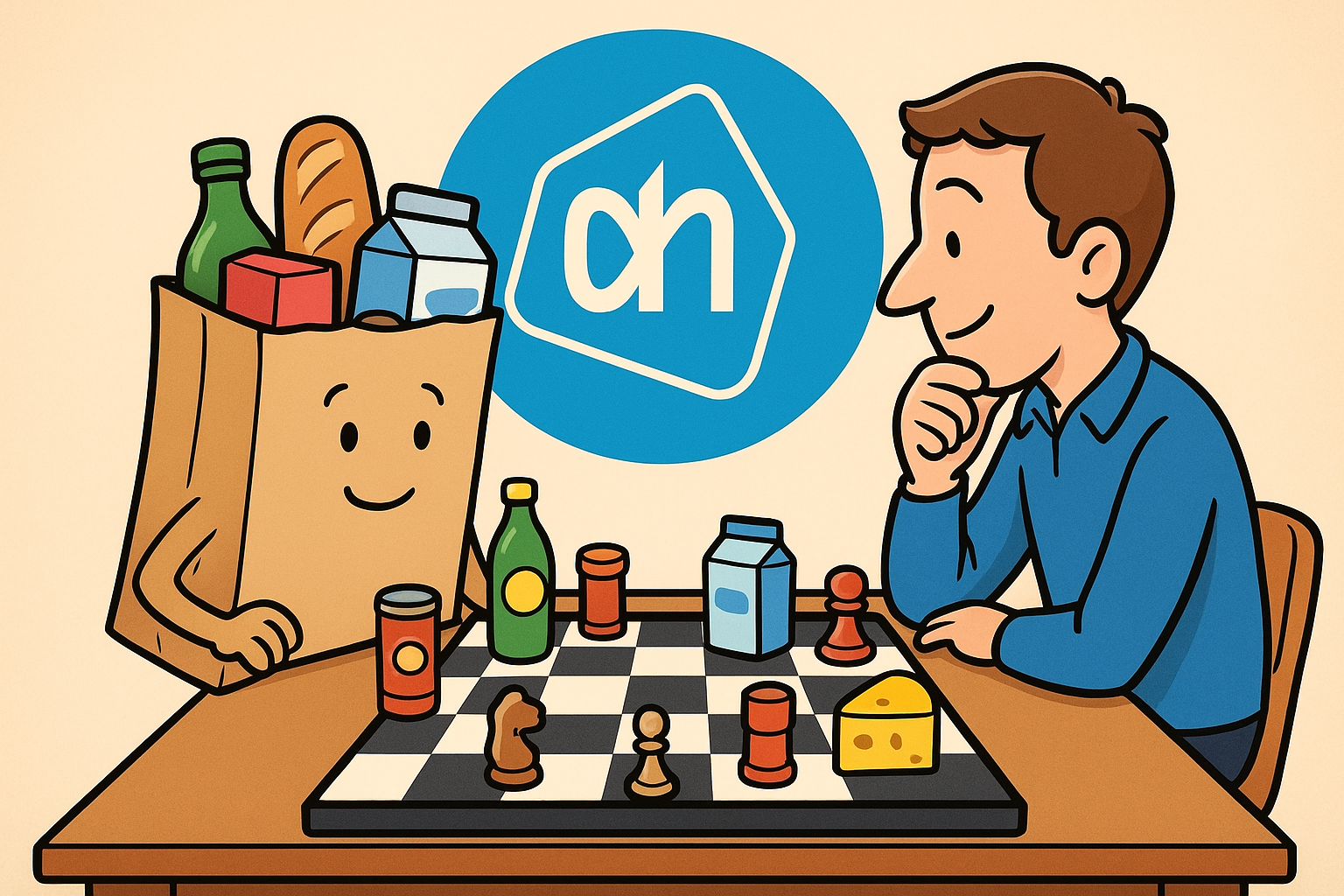 Zaterdag 22 november sliep ondergetekende eens lekker uit. Vaag had hij nog iets in zijn hoofd over een KNSB-competitiewedstrijd, maar hij draaide zich toch lekker om. KiNG 2 zou het die middag zonder hem moeten doen. Tegen twaalf uur ging hij even boodschappen doen, voor zijn ontbijt, of lunch, hoe je het ook wilt noemen. Onderweg kwam hij Youri tegen. Youri komt van ver en was daarom al vroeg in Tilburg. Om de tijd te vullen, liep hij gezellig mee. Misschien kon hij nog wat inspiratie opdoen bij de supermarkt met de afkorting AH, de buitenste twee lijnen van een schaakbord.