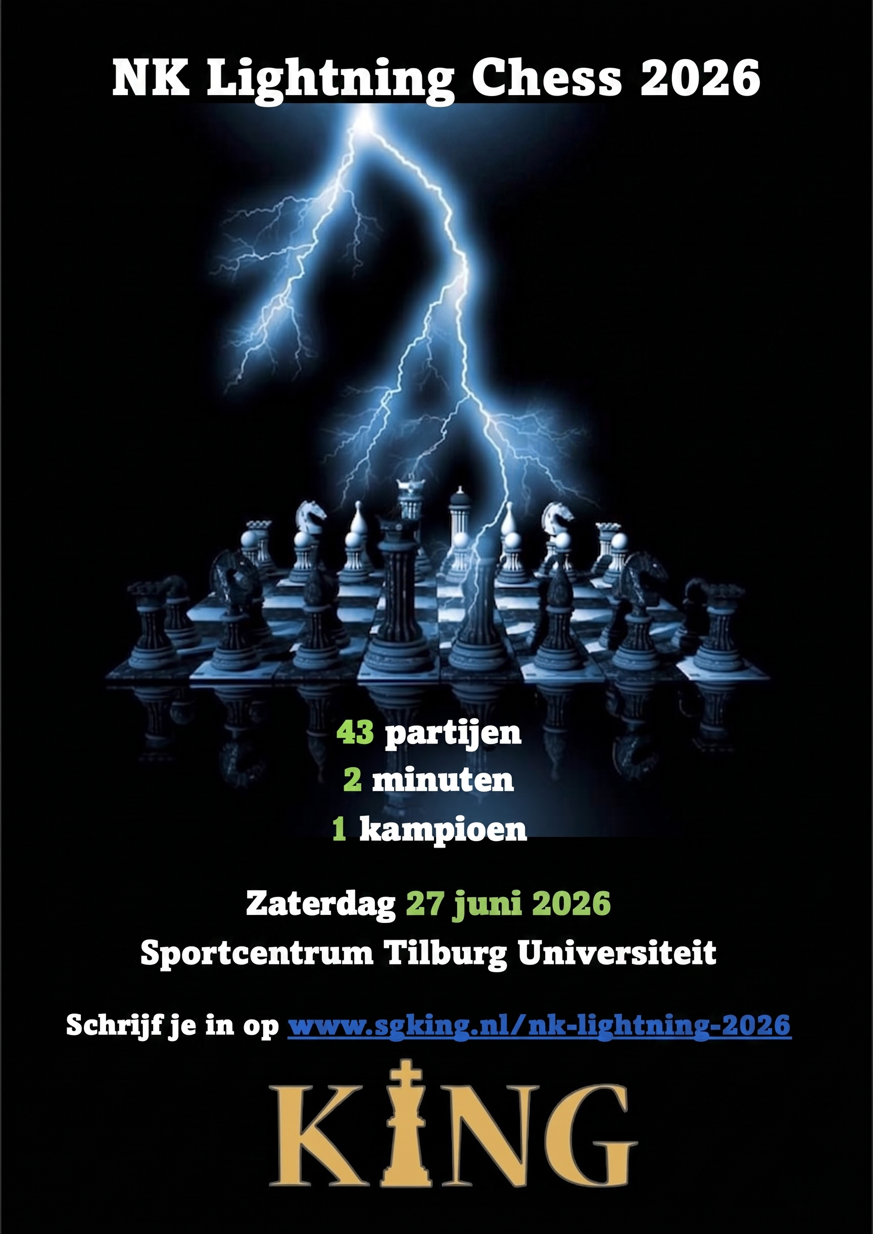 Op zaterdag 27 juni is het zover! SG KiNG organiseert voor de 11e keer het NK Lightning Chess, dit jaar op de prachtige nieuwe locatie van het Sportcentrum Universiteit Tilburg.