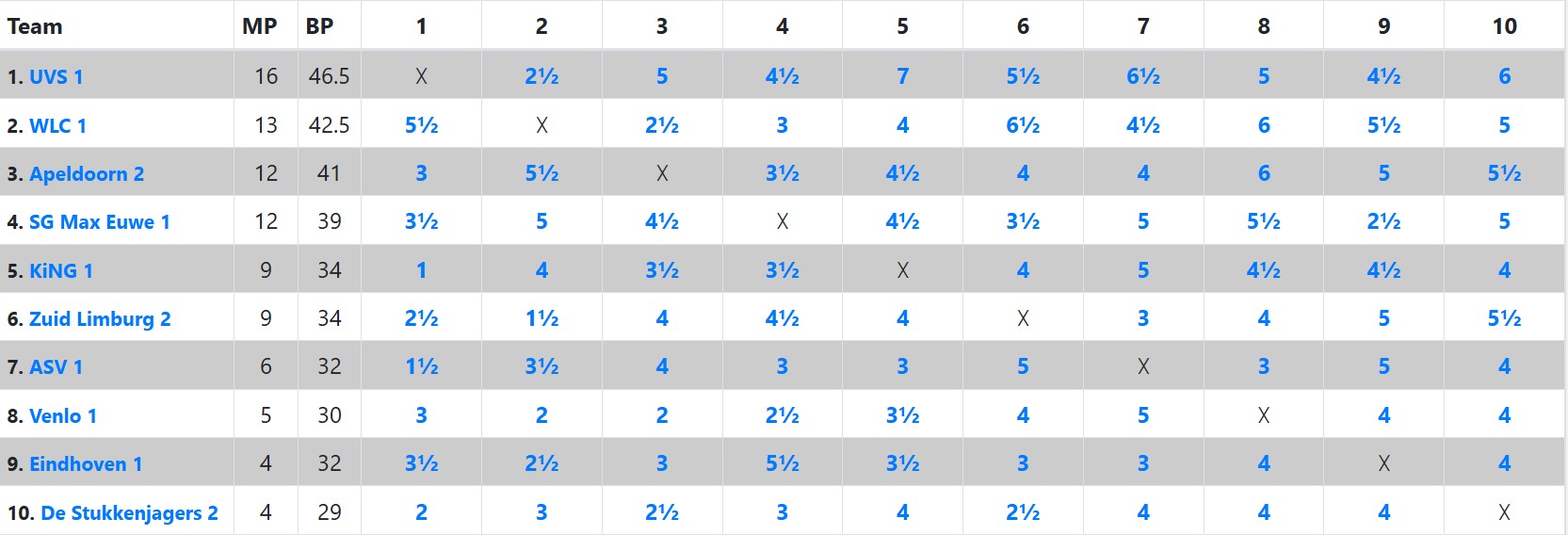 De laatste ronde alweer van het seizoen. Een match die weinig waarde meer had, maar wel voor een goed gevoel kon zorgen. Waar het seizoen moeizaam begon, werd er gedurende het seizoen steeds meer de lijn naar boven ingezet. Met daarbij eigenlijk altijd spannende matches. Op een uitzonderlijke 7-1 nederlaag tegen de koploper na, werden alle matches afgesloten met een 4,5-3,5 (in positieve en negatieve zin) of 4-4 uitslag.