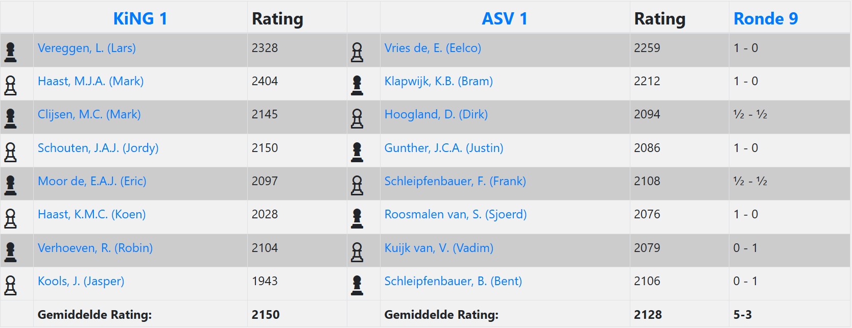 Ten slotte was het Jordy die al een lange periode een kwaliteit voor stond. Eerst niks weggeven en de tijdnoodfase overleven, daarna was het snel op zoek naar een geforceerde dame ruil. Een eindspel met toren 4 vs loper 4 was echter niet meer al te ingewikkeld om te winnen. En daarmee werd Jordy de matchwinner. 5-3