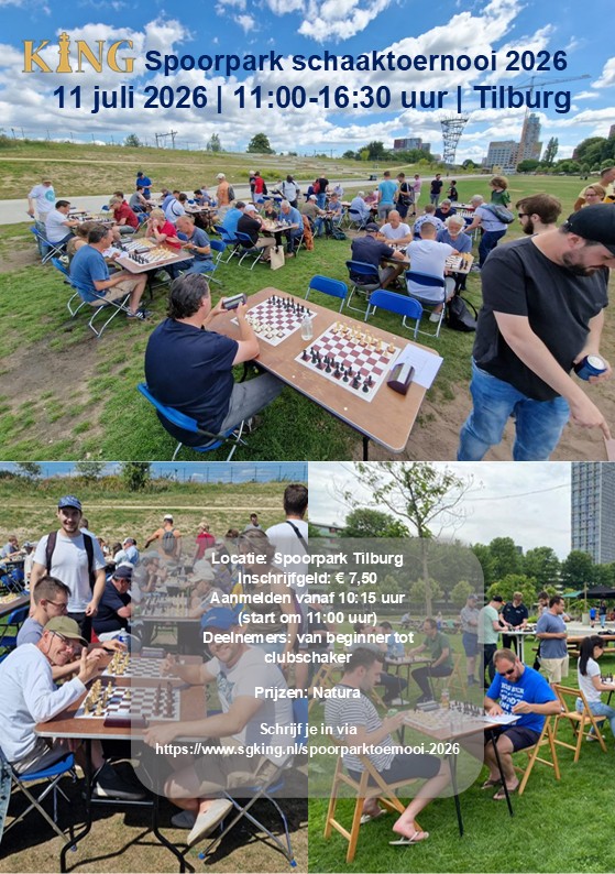 Zaterdag 11 juli 2026 is het weer zover, dan organiseert SG KiNG weer het succesvolle spoorpark schaaktoernooi! Na succesvolle vorige edities, met gemiddeld maar liefst 75 deelnemers, gaan we op 11 juli net als afgelopen jaren een snelschaaktoernooi in de buitenlucht organiseren. Het speeltempo is 5+0 minuten per persoon. Het toernooi vindt zoals elke editie plaats in het Spoorpark te Tilburg, naast het prachtige centraal gelegen restaurant T-huis.